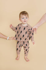 Make a bold yet effortless statement with this mocha two-piece set with black lightning bolts, designed for comfort, confidence, and standout style. This matching set blends cozy wearability with an eye-catching graphic design, making it perfect for lounging, play, or everyday casual wear.
